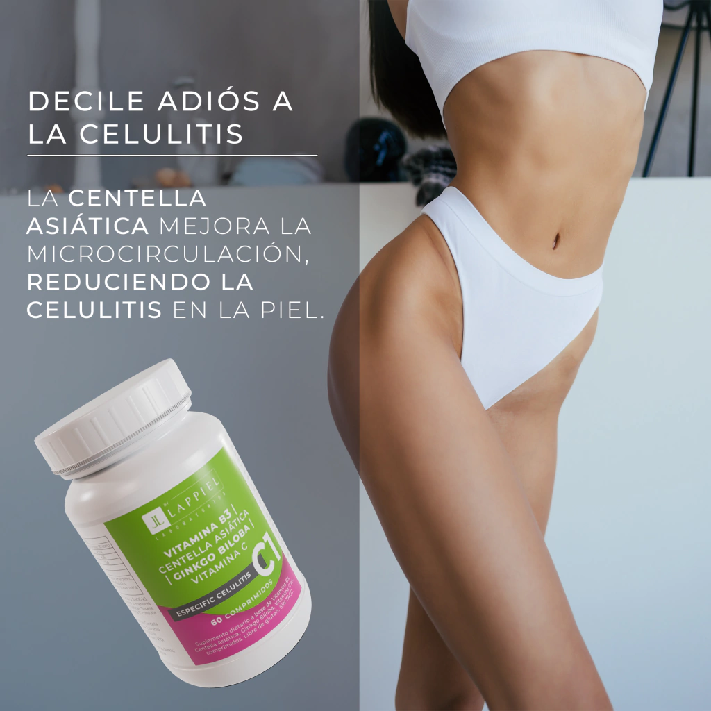 Suplemento dietario a base de Centella Asiática, Ginko Biloba, Vitamina B3 y Vitamina C. Reduce la celulitis y mejora la circulación.