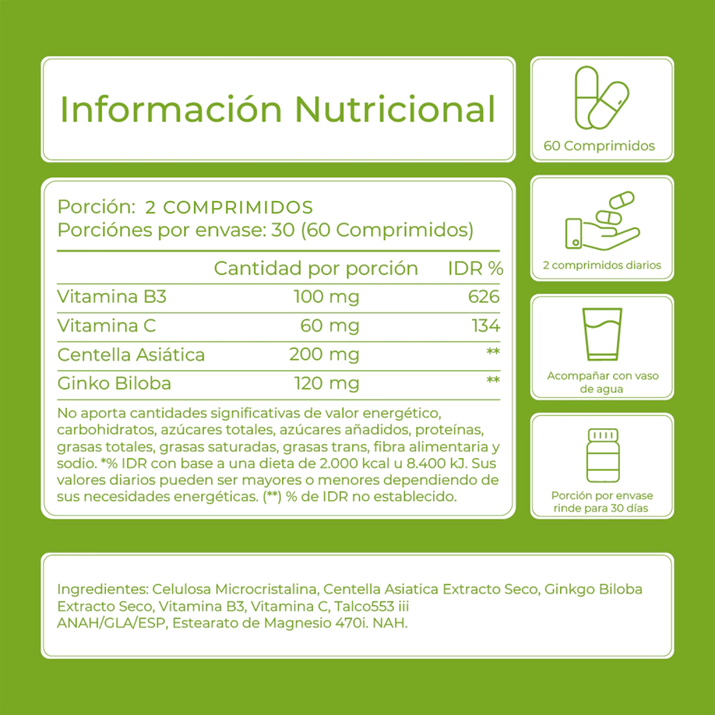 Centella Asiática, Ginko Biloba, Vitamina B3 y Vitamina C.