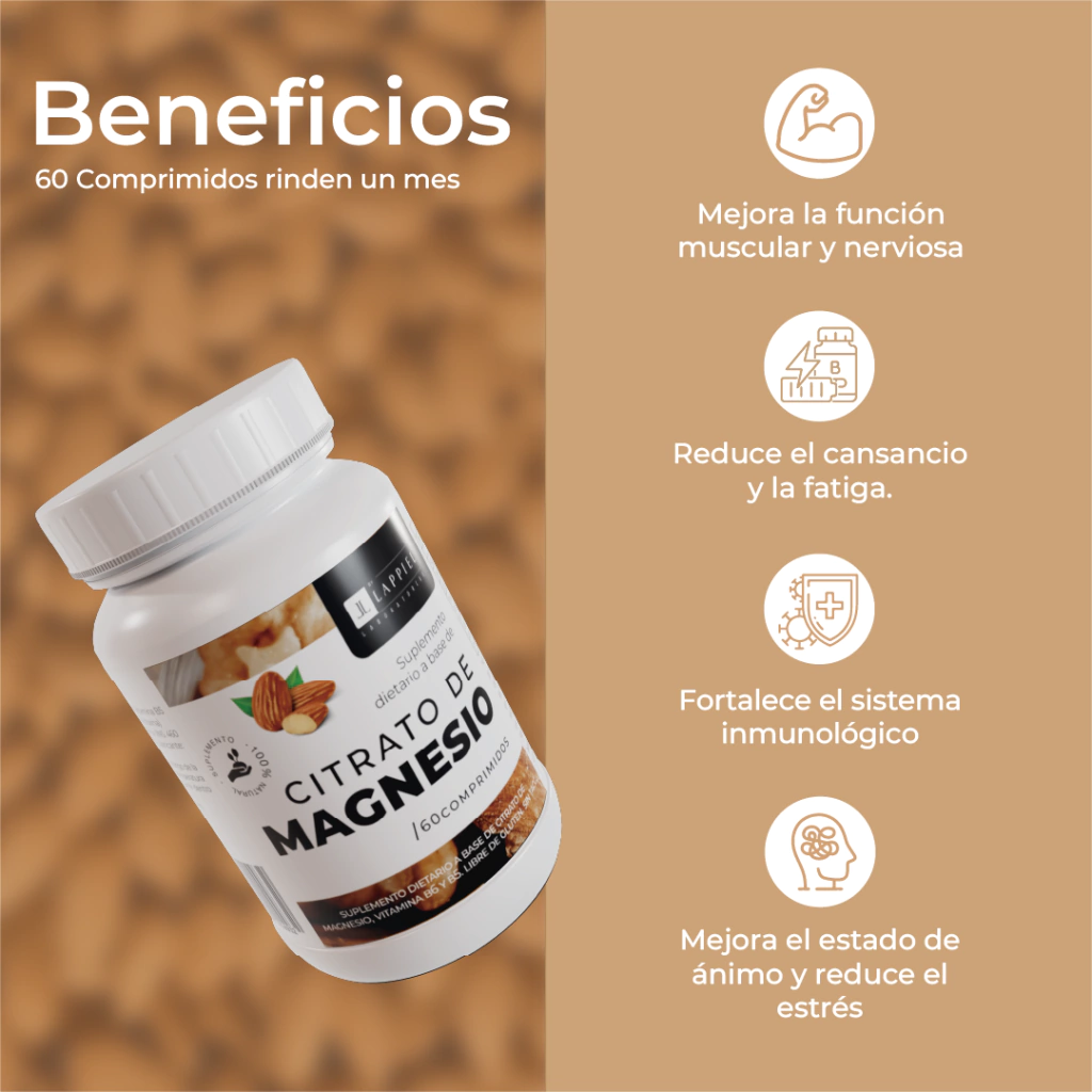 Suplemento dietario a base de Citrato de Magnesio. El Magnesio es un mineral súper esencial que ayuda a que nuestro cuerpo funcione de la mejor manera: Ayuda a que nuestros nervios y músculos funciones al máximo y a que nuestro sistema inmunológico funcione de manera saludable. El Magnesio es importante para la producción de energía, el metabolismo de la glucosa y la forma en que nuestro ADN se sintetiza en nuestro cuerpo. Apoya la salud de las neuronas, la salud de los huesos y la salud del corazón. De hecho, es un cofactor para más de 300 procesos enzimáticos en el cuerpo.