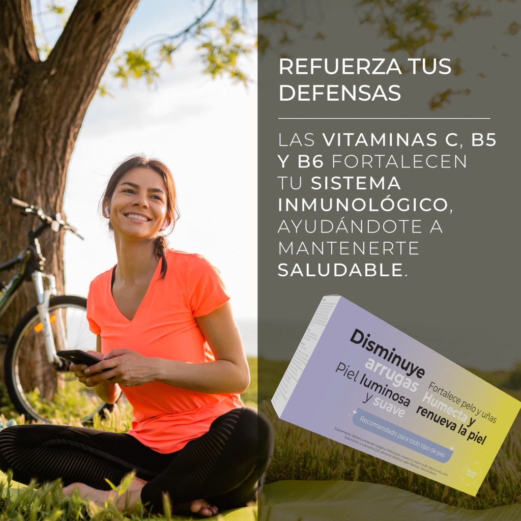 Mejora el aspecto de la piel, previene la formación de arrugas, aumenta las defensas y protege contra radicales libres.