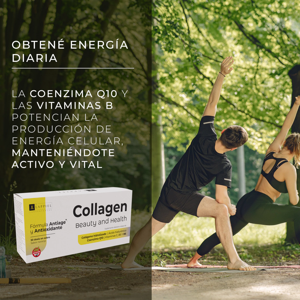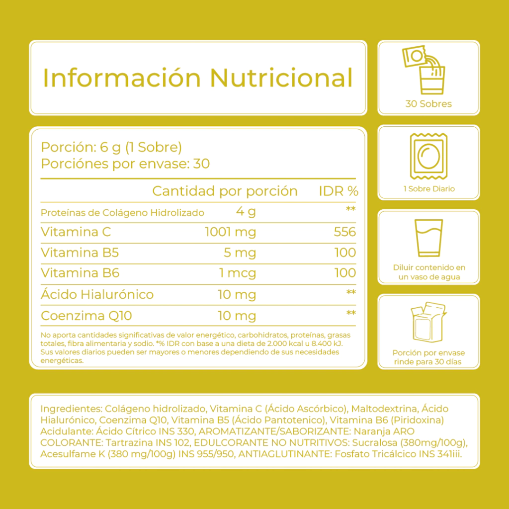 Suplemento dietario a base de Colágeno hidrolizado, Ácido hialurónico, Coenzima Q10, Vitaminas C, B5 y B6.