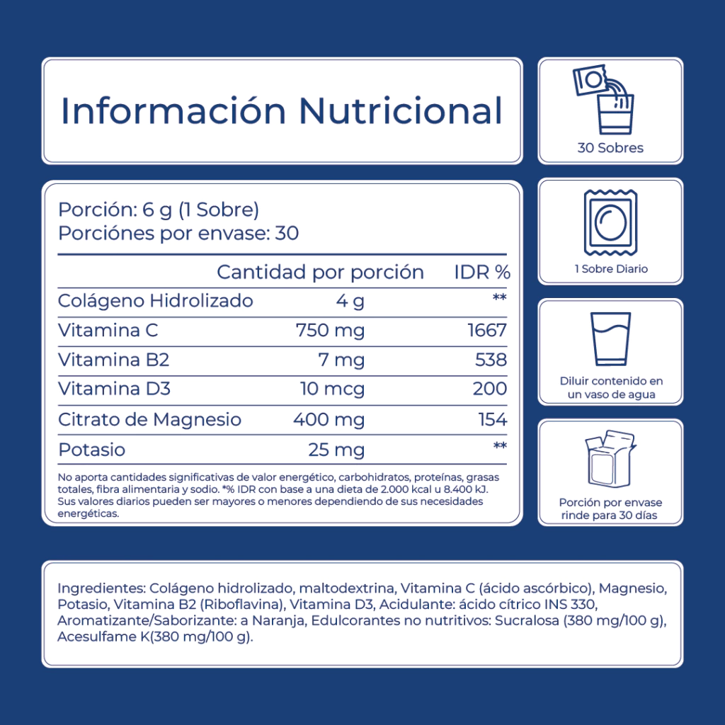 Suplemento dietario a base de Colágeno hidrolizado , Vitamina C , Potasio, Citrato de magnesio, Vitamina b2 ,y b3 en polvo. Sabor naranja, libre de gluten. SIN TACC.