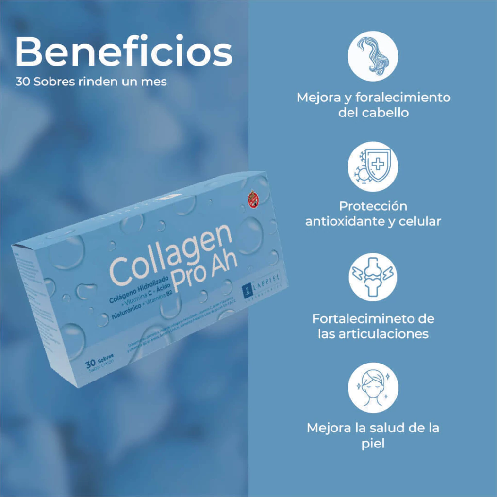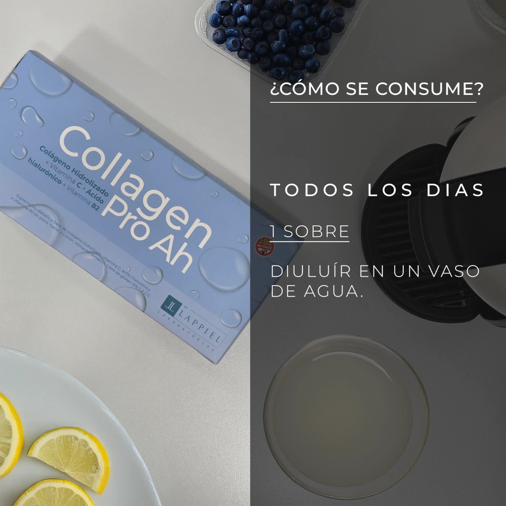 Colágeno Pro AH es un suplemento dietario a base de colágeno hidrolizado, Ácido Hialurónico y Vitamina C en polvo. Elimina la flacidez cutánea y corporal, mejora la hidratación de la piel y previene la formación de arrugas·