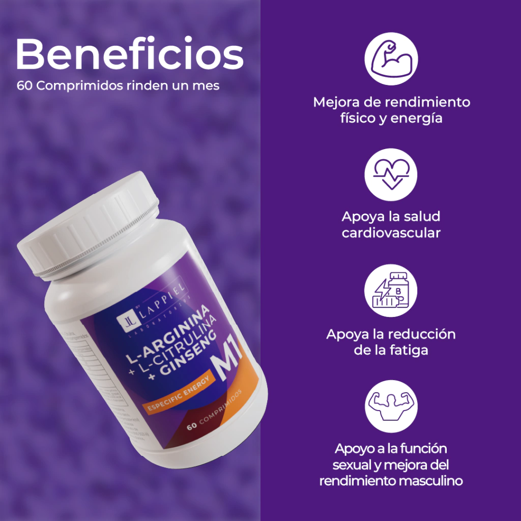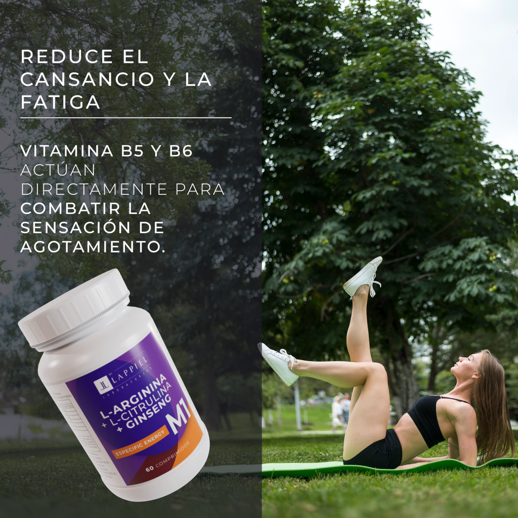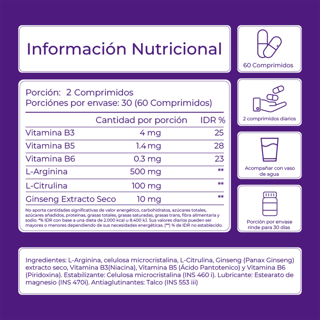 Composición L-Arginina, L-Citrulina y Ginseng, Vitaminas B3, B5 y B6.