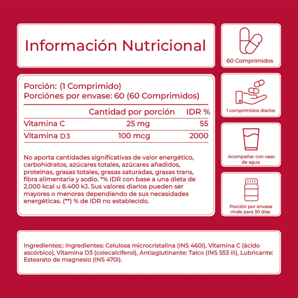 Este suplemento alimenticio está diseñado para potenciar tu salud ósea, fortalecer el sistema inmunológico y brindarte energía diaria. Cada comprimido contiene 100 mcg de vitamina D3 y 25 mg de vitamina C, en una fórmula efectiva y de alta calidad.